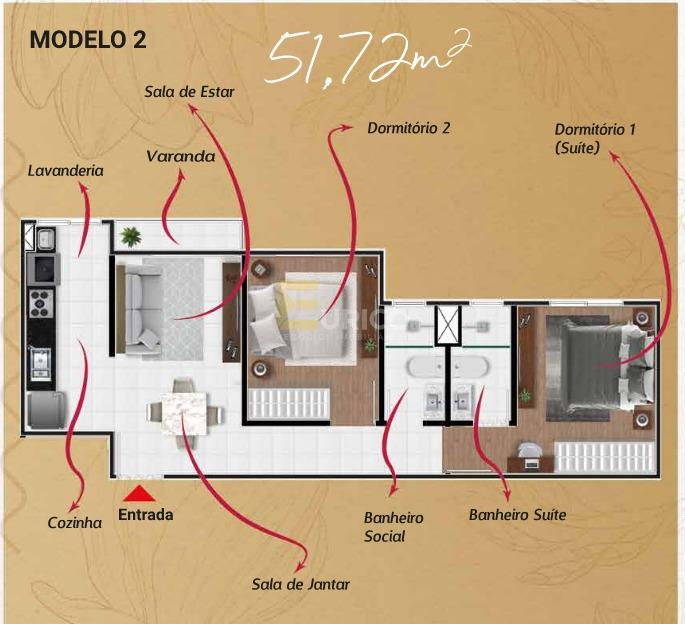 Apartamento de 51,72 m² na planta, 2 dormitórios sendo 1 suíte, 2 banheiros, sala de jantar e estar integradas, lavanderia, varanda e 1 vaga de garagem.