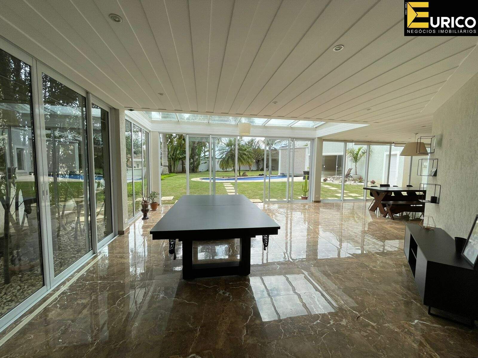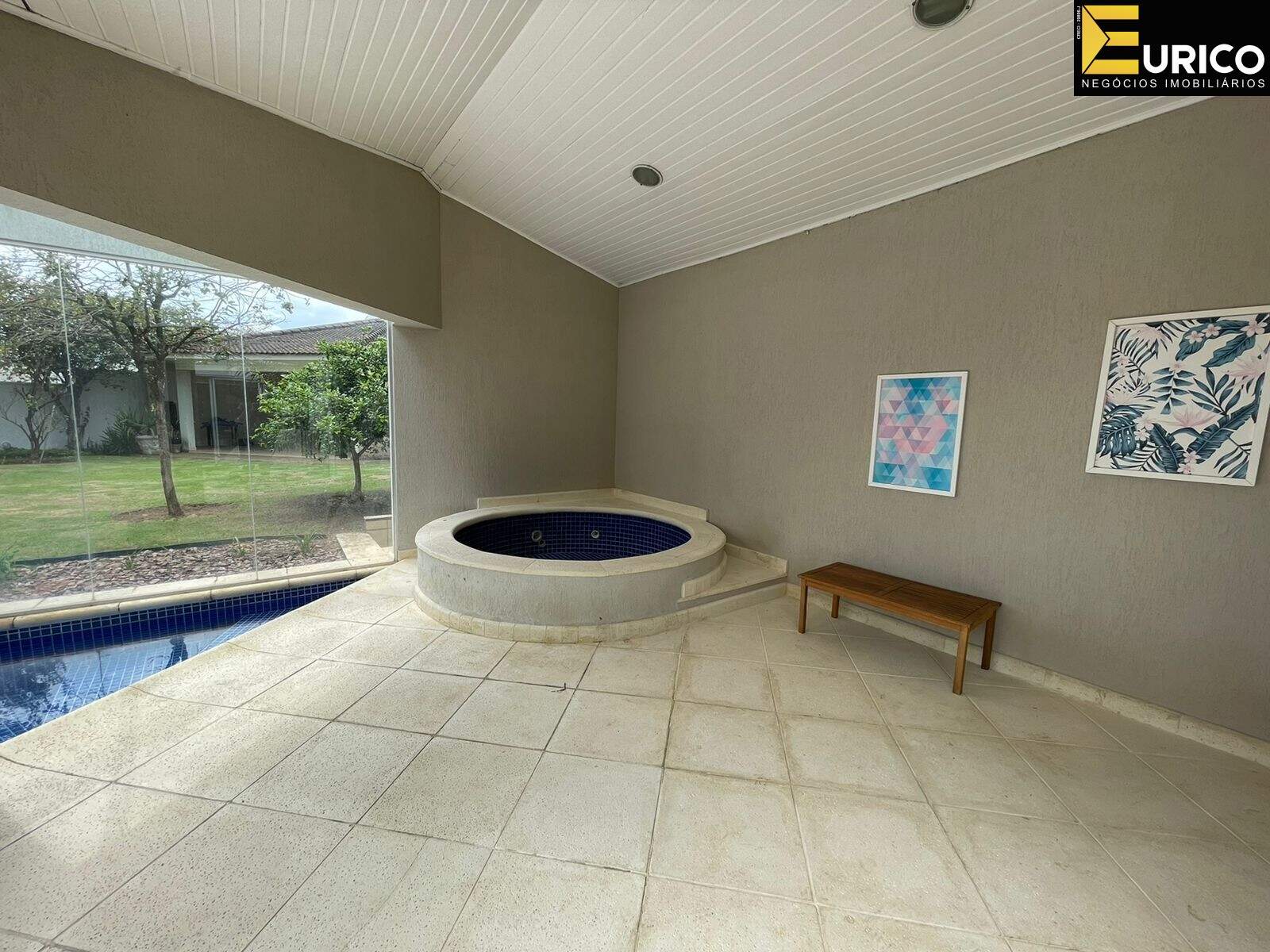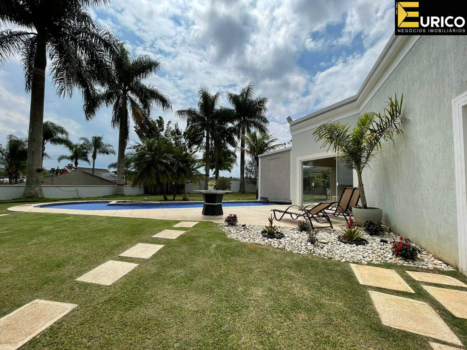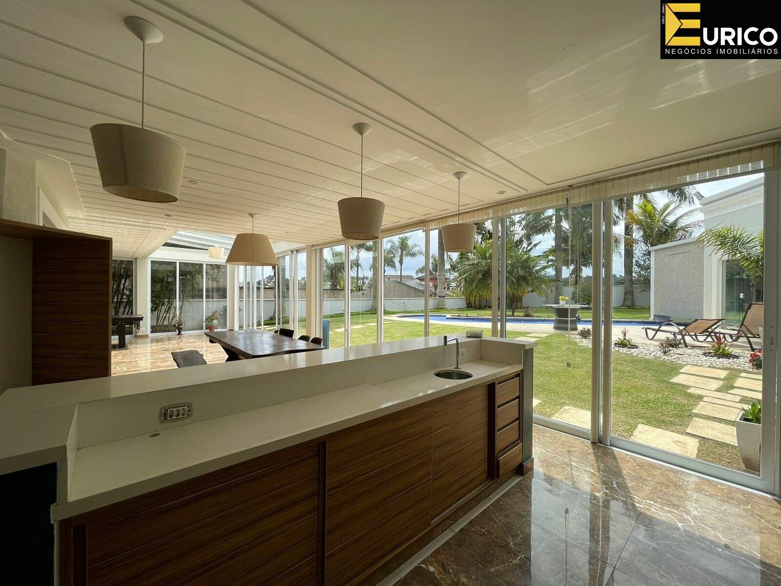 Hall, escritório, lavabo, sala de estar com 110 metros, sala de jantar, home com lareira, copa, cozinha, lavanderia com área externa independente, área gourmet ampla e iluminada interligada a casa e ao jardim, com churrasqueira e fogão a lenha, jardim formado com frutíferas e palmeiras reais, piscina, cascata, jacuzzi, sauna, ducha.