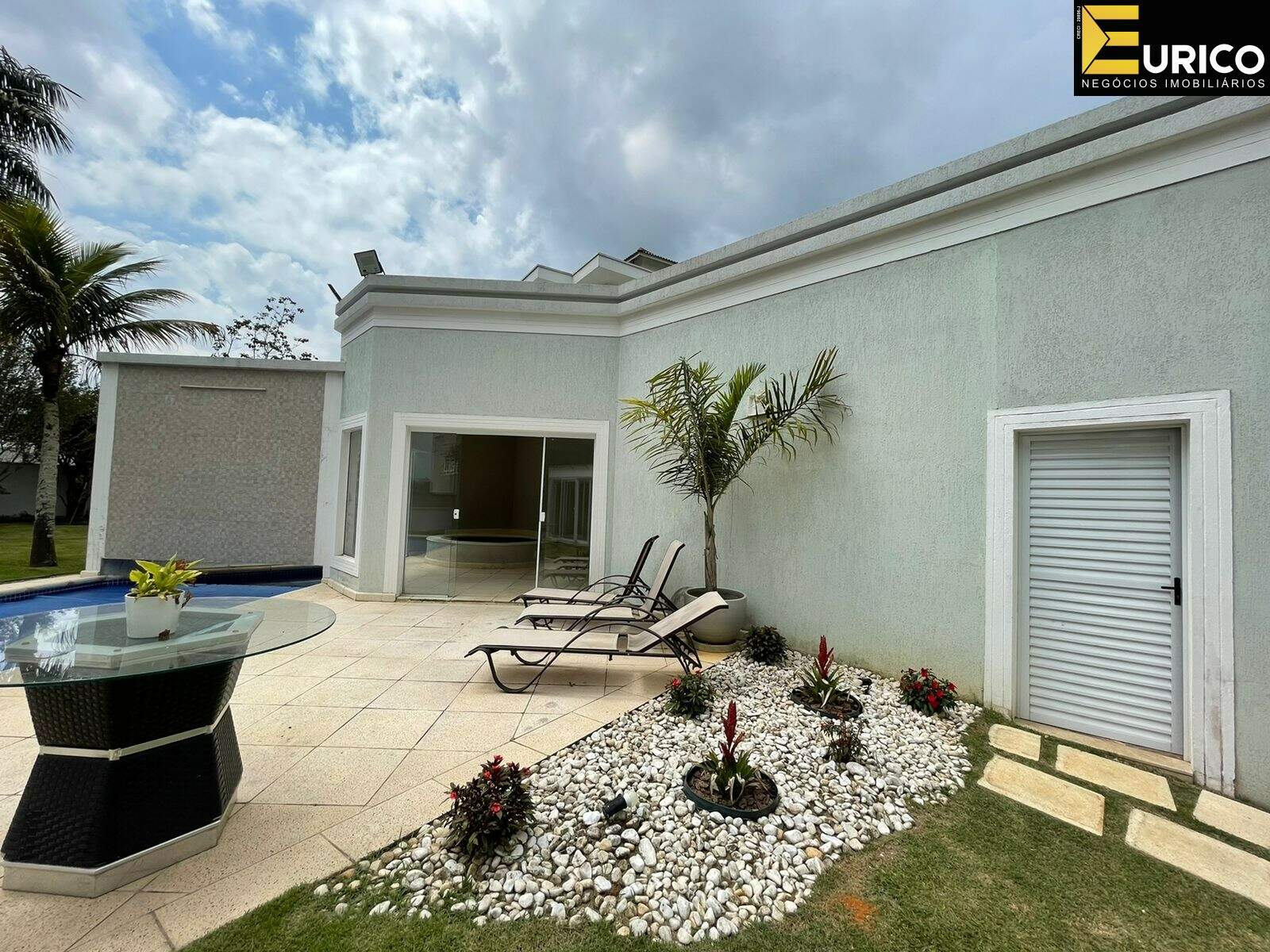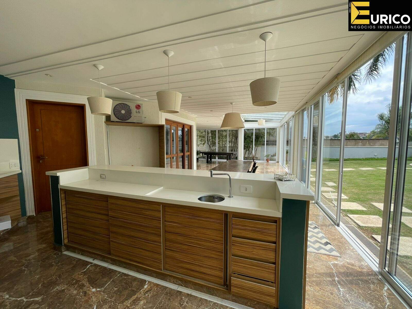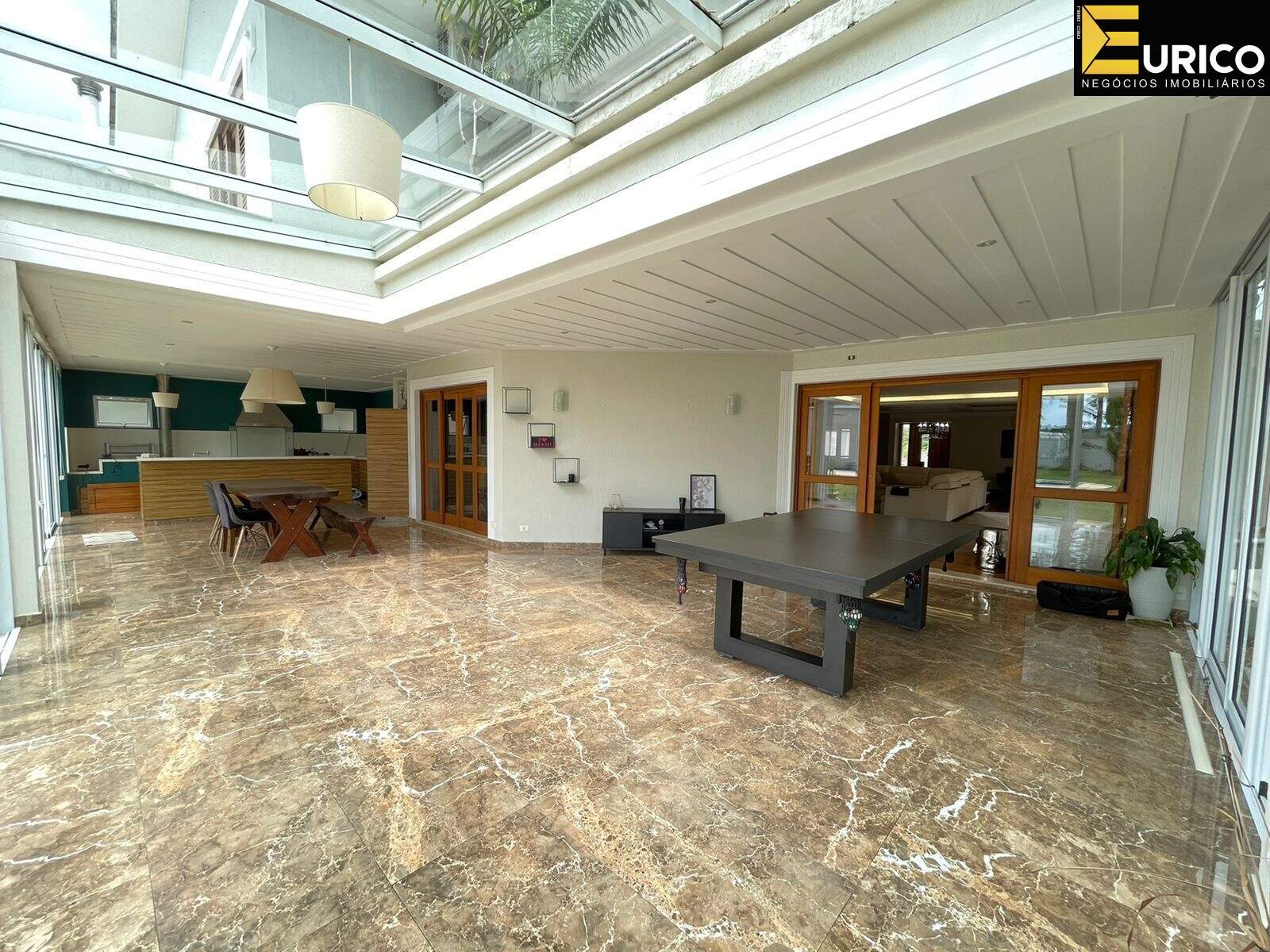 Hall, escritório, lavabo, sala de estar com 110 metros, sala de jantar, home com lareira, copa, cozinha, lavanderia com área externa independente, área gourmet ampla e iluminada interligada a casa e ao jardim, com churrasqueira e fogão a lenha, jardim formado com frutíferas e palmeiras reais, piscina, cascata, jacuzzi, sauna, ducha.